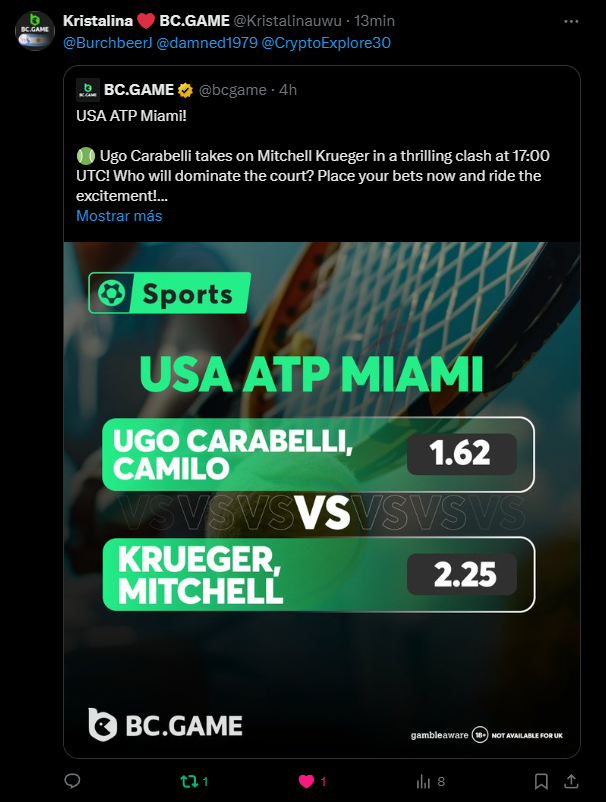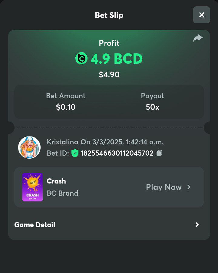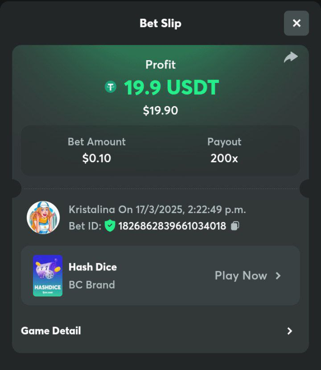 Easy 1. Deposit Txid: 4434113e293eb472a7b171d17fbe54cbfb34631824705869716f789ec0040181 2. Instagram: @LincesaMdq 3. Instagram Post: https://www.instagram.com/p/DHXgr4JspCP/?igsh=ZWgwenpqYXVreTF 4. Twitter: @Kristalinauwu 5. Like, retweet & tag: @Kristalinauwu https://x.com/Kristalinauwu/status/1901728054969274750 6. Follow BCGame Facebook: Gisela Gall 7. Limbo: https://bc.co/game-detail/1825513481832927011 8. Sports bet: Ticket ID: 2513820866270339253 9. Arabian Secret: https://bc.co/game-detail/1825439374915515681 10. Sugar Fiesta 1000: https://bc.co/game-detail/1825441146495751971 11. 2FA activated: Medium 1. Deposit TxID: 4d707ead402ff5771e270374a5fc42f5798fdc6bd13d6bf975996a5316cb53ff TxID: 39d9776a52287c2bdc8bea45c1a751ae618ef4976ed8907766ce39ac0603937f 2. Crash: https://bc.co/game-detail/1825546630112045702 3. Plinko: https://bc.co/game-detail/1825430753182757665 4. Roulette: https://bc.co/game-detail/1825527742035924514 5. Starshine Princess 1000: https://bc.co/game-detail/1825598330617384993 6. Stellar Rush: https://bc.co/game-detail/1825601183186807841 7. Keno: https://bc.co/game-detail/1825612623614982433 8: Poker Ways: https://bc.co/game-detail/1825547398747784483 9. Wukong: https://bc.co/game-detail/1825595350268898850 10. Lottery and Porsche tickets: 11. Sports bet Combo Ticket ID: 2512055034057994476 Hard 1. Wheel: https://bc.co/game-detail/1825529693239491107 2. Crash: https://bc.co/game-detail/1825774085023770502 3. CoinFlip: https://bc.online/game-detail/1825620056214876707 4. Stellar Rush: https://bc.co/game-detail/1826242186137422626 5. Plinko: https://bc.co/game-detail/1825459660201698850 6. Limbo: https://bc.online/game-detail/1826864347105905955 7. Hashdice: https://bc.online/game-detail/1826862839661034018 8. Sea of Olympus 1000: https://bc.co/game-detail/1825539068560977186 9. Gold of Olympus: https://bc.online/game-detail/1826344599486243619 10. Duck Hunter: https://bc.co/game-detail/1825605420251285539 11. Sports bet combo Ticket ID: 2513187573116055908