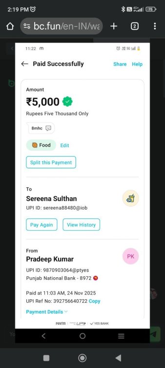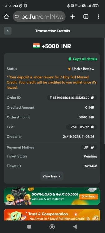 5. Dear BC.Game Support, Moderators & Admin, I am escalating this publicly because my ticket has been completely ignored for 14+ days. Deposit Details: Amount: ₹5,000 Date & Time: 24-Nov-2025, 11:03 AM IST UPI Ref No: 392756640722 Recipient: Sereena Sulthan (sereena88480@iob) My Bank: Punjab National Bank (Payment 100% successful) Order ID: F-1849648644640825672 Ticket ID: 9491468 (Still showing Pending) Current Status on site: “Under Review – 7-Day Full Manual Credit” → 14 days ho chuke hain, 0 INR credited Screenshots attached: Paytm/UPI successful payment proof BC.Game deposit page showing “Under Review” This is clearly not normal. BC.Game deposits never take 7-14 days for “manual review”. If this ₹5,000 is not credited to my wallet within the next 24 hours, I will be forced to: File official complaint on cybercrime.gov.in Report to RBI Ombudsman for UPI fraud
