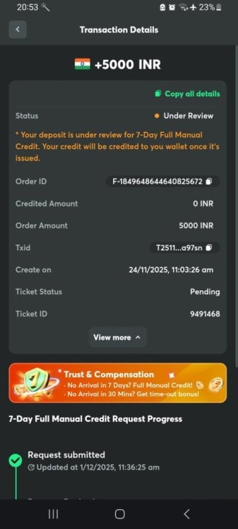 7. Hello BC.Game Support Team & Moderators, I urgently need help with a deposit that has been pending for over 12 days now. Deposit Details: • Amount : ₹5,000 INR (Fiat via UPI) • Deposit Date : 24 November 2025 • Transaction ID : T2511...a97sn (full Tx ID in screenshots) • Order ID : F-184... (visible in screenshots) • Support Ticket ID : #9491468 • Actions taken : Already submitted “Speed Up the Deposit” + Manual Credit Request on 1 December 2025, but still no reply and no funds credited. All details attached on ticket I am not able to upload file please check this ticket or help me