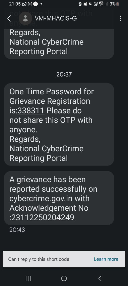 1. Status of your grievance reported on cybercrime.gov.in with Acknowledgement No. : 23112250204249, has changed to Accepted. Login to view the details.