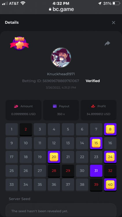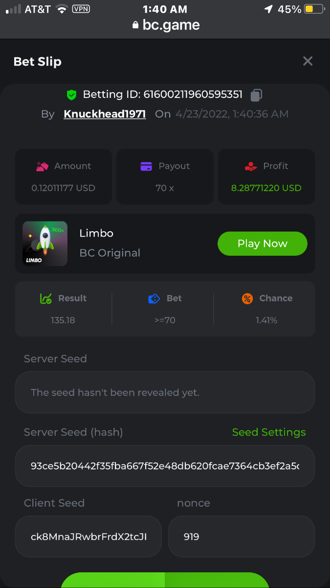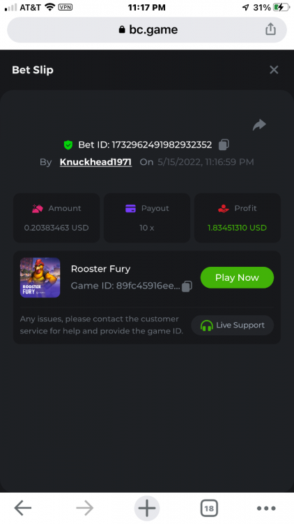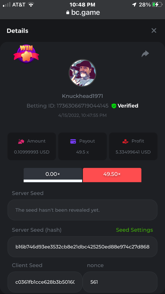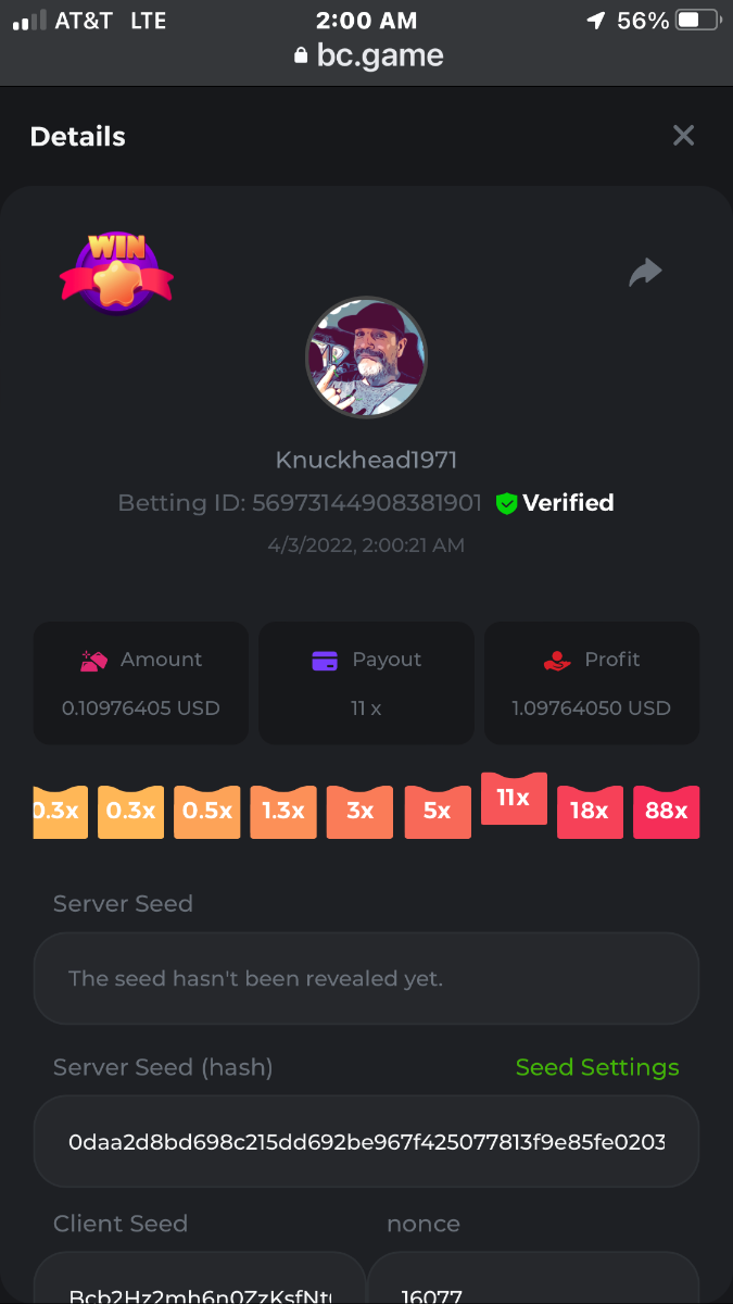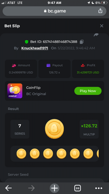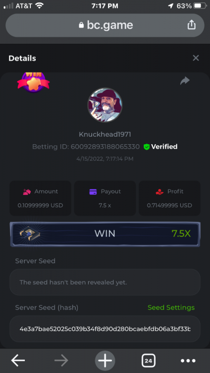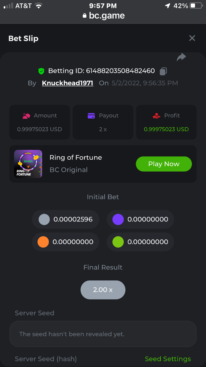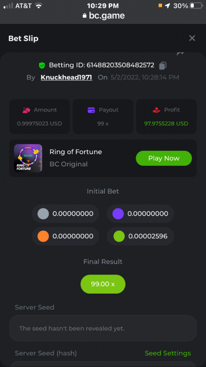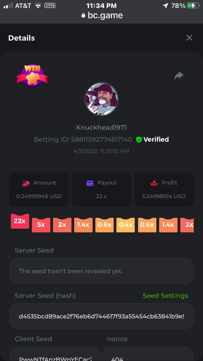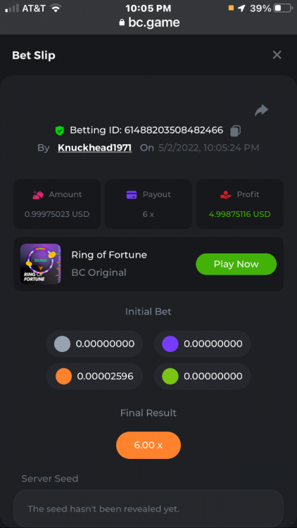 7. Grey https://bc.game/sd/?sd=10JQ3N5PEGGS2B purple https://bc.game/sd/?sd=10JQ3SOXMDQ5G3 orange https://bc.game/sd/?sd=10JQ46HQF3BBIR green https://bc.game/sd/?sd=10JQ5MRG4GET5F All wins are in order verified by time and date in succession grey first and green last bet was .00002596 BTC = $1.00 USD