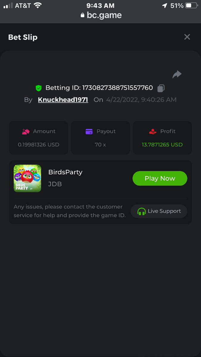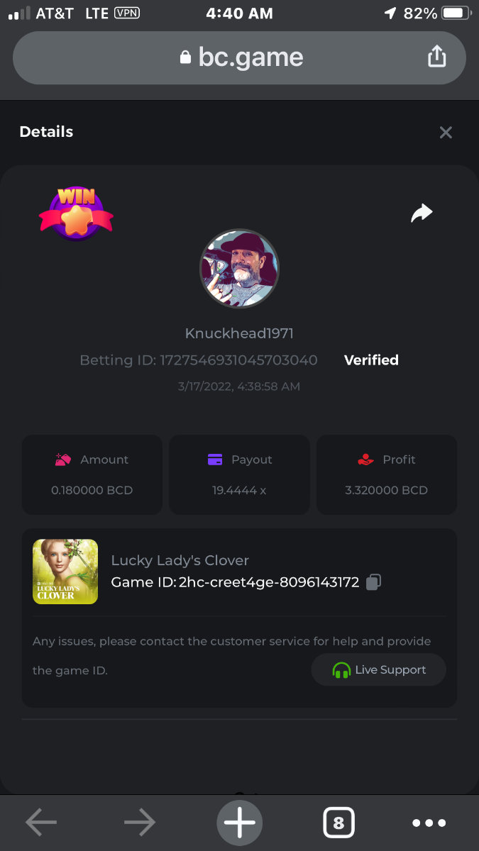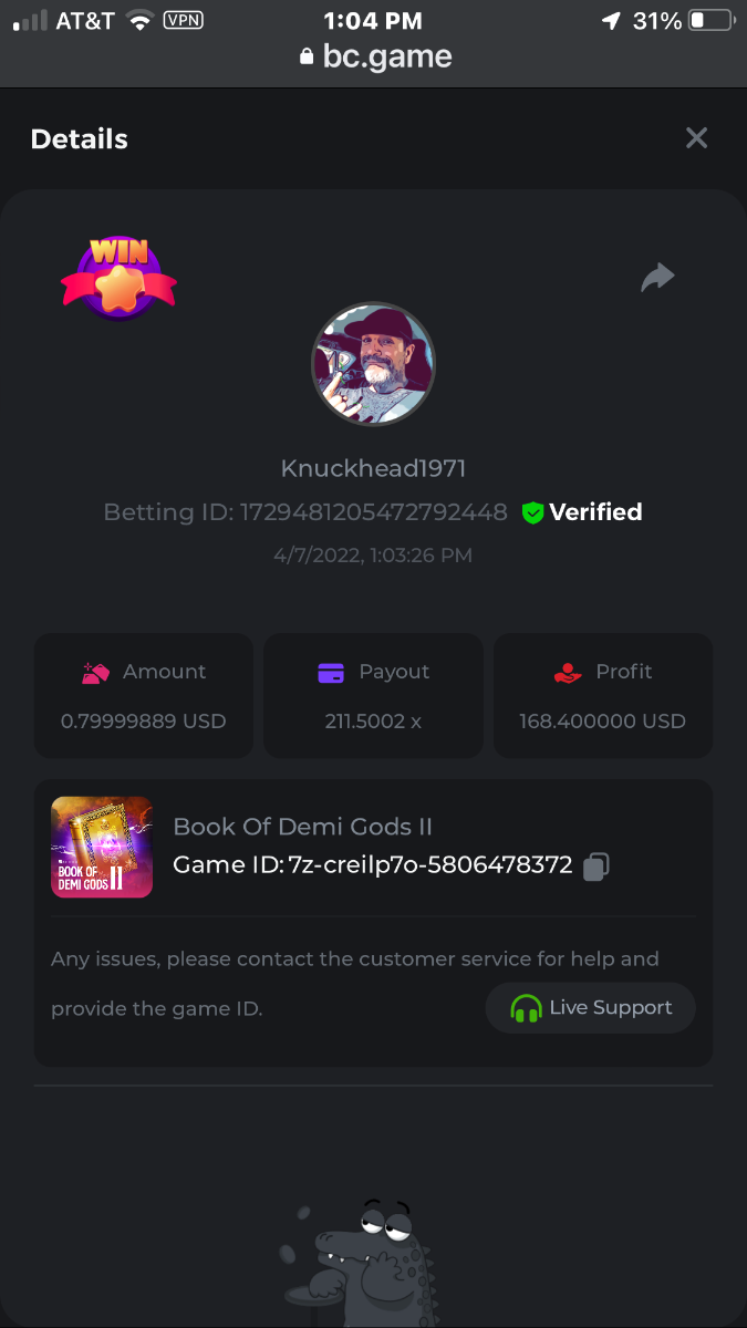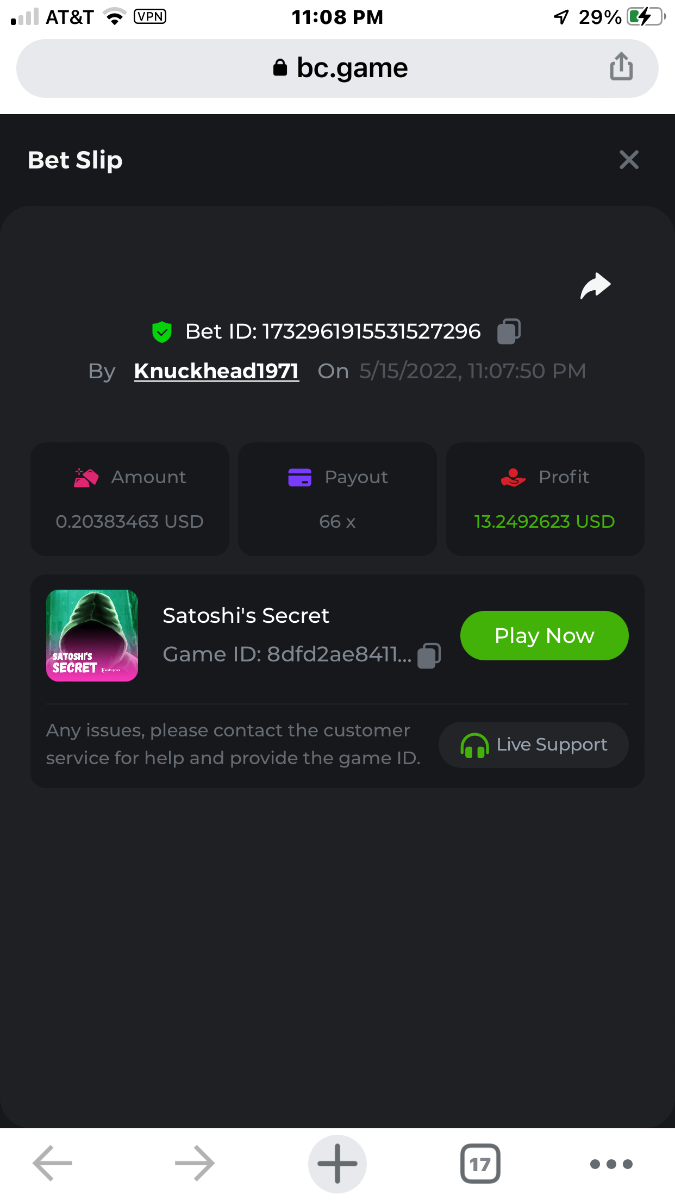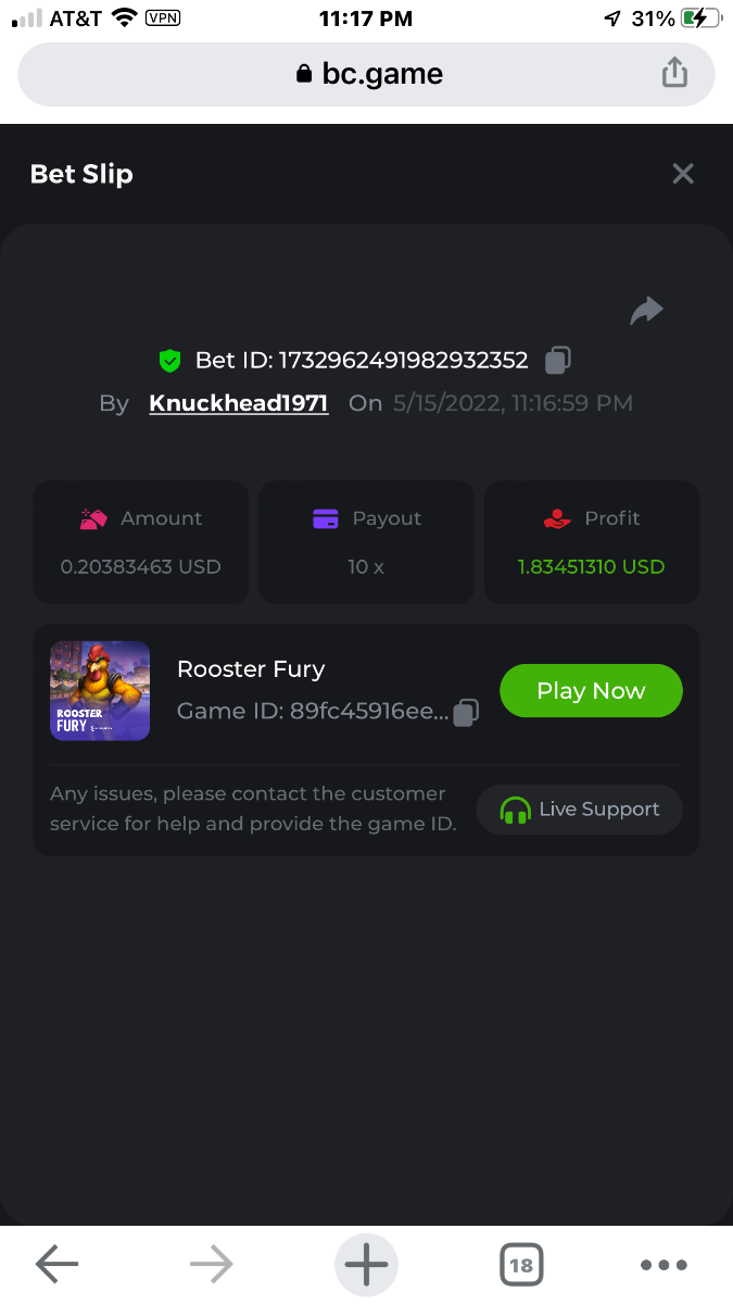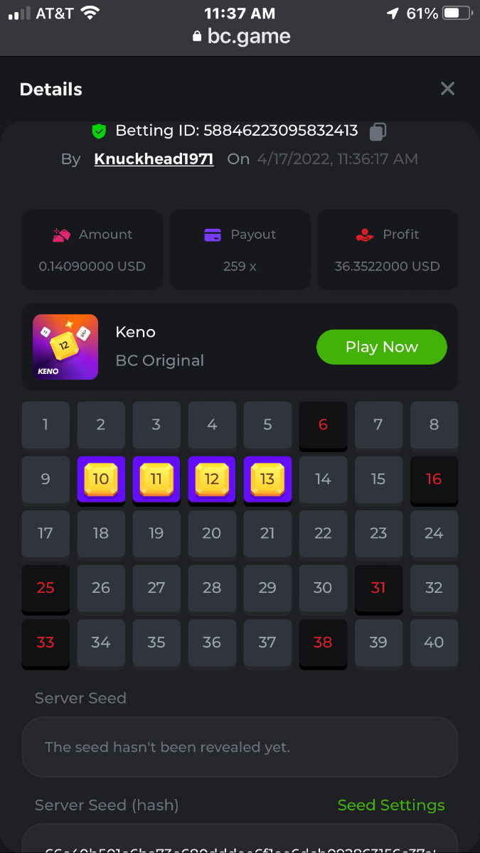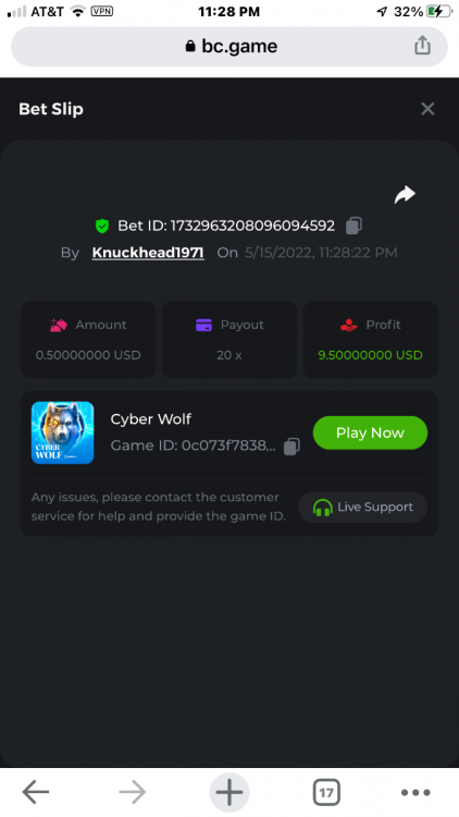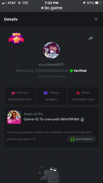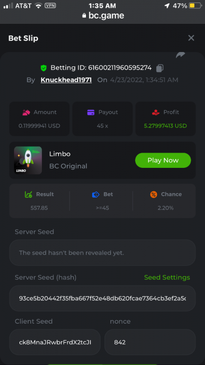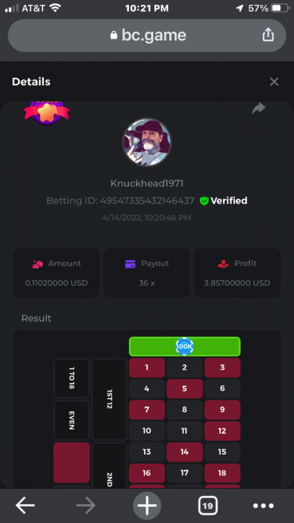 7. Grey https://bc.game/sd/?sd=10JQ3N5PEGGS2B purple https://bc.game/sd/?sd=10JQ3SOXMDQ5G3 orange https://bc.game/sd/?sd=10JQ46HQF3BBIR green https://bc.game/sd/?sd=10JQ5MRG4GET5F All wins are in order verified by time and date in succession grey first and green last bet was .00002596 BTC = $1.00 USD