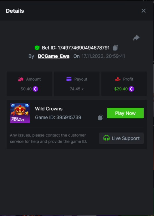 $1,500 Weekend Multiplier Battle Hey, hey, VIPs! We're delighted to announce new a weekend-long battle with the Platipus provider this time. The event will occur from November 18, 09:30 am GMT until November 21, 09:30 am GMT. To qualify for the prize, you must participate and get the highest multiplier possible on the games listed below. This is your chance to win some rewards and show off your skills. So get ready to battle it out and have some fun! - (details further down). Duration: 18/11/2022 9:30 AM – 21/11/2022 9:30 PM UTC Prize Pool: $1,500 Eligible Games: Play below games to participate in this event: Wild Spin Wild Crowns Book of Light Lucky Cat Ways of the Gauls The highest multiplier reached in each game will be added together and counted as total points. Bonus buys are allowed. If the player submits multiple winning entries for the same game, the entry with the highest multiplier will be valid. Minimum VIP Tier Must be VIP04 or higher in order to enter this event. Minimum Payout Minimum payout to qualify is 10x (in any game) for a valid entry. Minimum Bet Size Wild Spin - $ 0.5 Wild Crowns - $ 0.4 Book of Light - $ 0.4 Lucky Cat - $ 0.5 Ways of the Gauls - $ 0.5 Eligible Coins All cryptocurrencies are eligible (excepting JB, and BCL). Free Play Mode is not valid for this event. Prize Pool & Reward Breakdown The winners will win a share of the prize pool based on the detailed ranking below. All other participants who complete all minimum requirements will receive a 35% share of the prize pool. How to Enter Access the game to select your Bet ID, click on the Share icon (↷) and then Copy link. Return to the topic, paste the link in the field "Reply to this topic..." E.g.: https://bc.game/#/sd/10XEBAGAE0Z2FN In the same post, upload a screenshot of your win by clicking the game ID WITH VIEW IN USD mode ENABLED (accessible at the bottom of dropdown menu for your wallet up top, and Submit Reply. Done! This way, we can ensure that your bet indeed met the minimum requirement at the time of placing it: https://bc.game/#/sd/10XEBAGAE0Z2FN Additional Rules: Please combine all of your hits together in a SINGLE post. Edit your existing post for additional hits, don't create a new post. Each eligible entry must have the Bet Slip URL, failure to include it will disqualify participation in the event. Bet Slip image is not mandatory. Bets must be posted within 24 hours of placing bet in order to keep things fair for everyone. Bets must be made during the specified time window stated above. This thread will lock automatically when the time period is over. One (1) entry per household. Anyone found attempting to win multiple prizes will be disqualified from this challenge as well as all future challenges. Failure to follow instructions will result in your submission being null and void. By entering this challenge, you acknowledge that BC.Game has the final decision on results and placement. Payouts will be distributed after the event is finished. Please note that it could take anywhere between 24 hours to 7 days after the completion of the event.