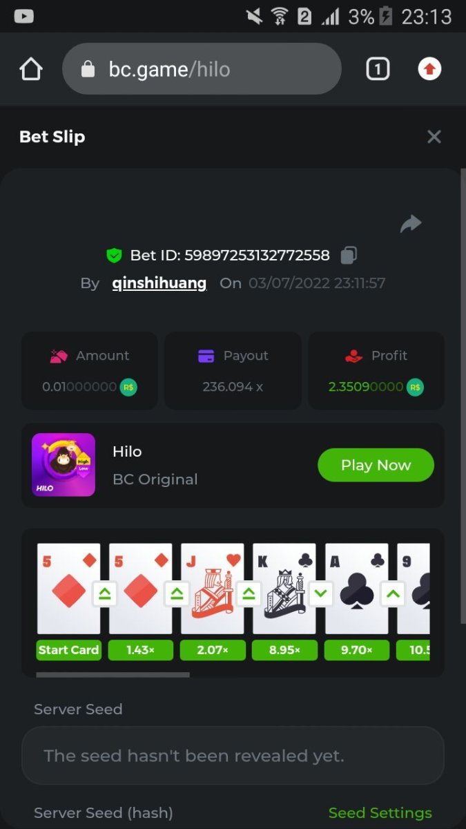 2º Lugar:  qinshihuang - 236.094 x (https://bc.game/user/profile/4326952) - 3 BCD