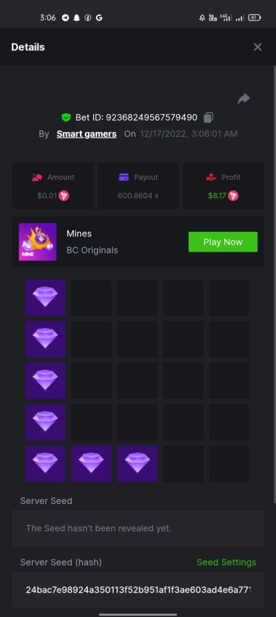 Victor777Binev Posted December 16, 2022 Share Posted December 16, 2022 can u give sample mines @Black Tiger about how many bomb and Diamond on every single 1bomb until 24 bomb ? thx Link to comment Share on other sites More sharing options...