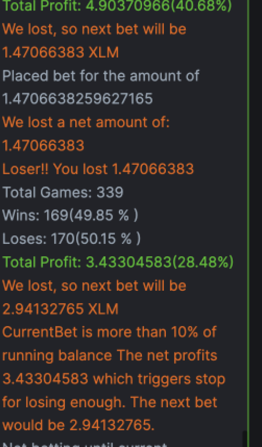 log.error('CurrentBet is more than 10% of running balance The net profits ' + netProfit.toFixed(8) + ' which triggers stop for losing enough. The next bet would be ' + currentBet.toFixed(8) + '.');