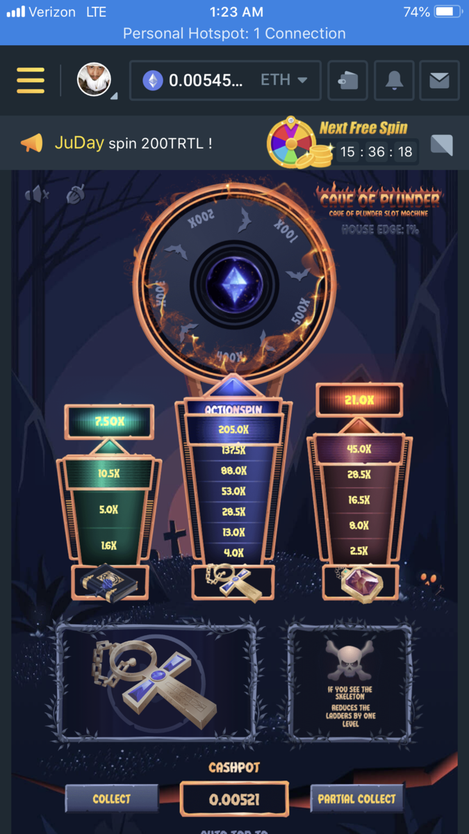 Im jealous - I've never hit action spins ever! Anyhow, thats a great jump from 0.001 to 0.5ETH đŸ™‚Â Congratulations on your win and thanks for sharing this with the community.