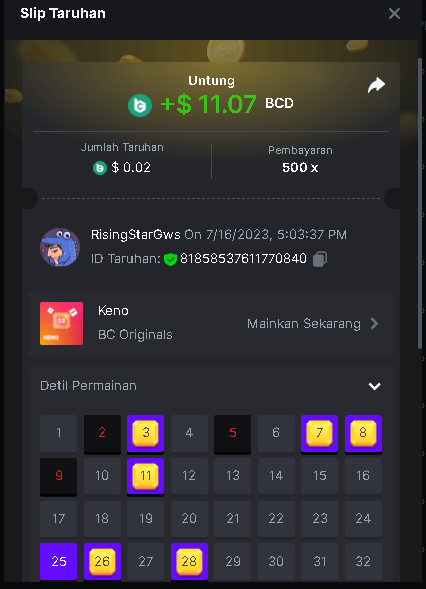 Moderator Giandreas Posted July 16, 2023 Moderator Share Posted July 16, 2023 Read Carefully Before Start To Hunt Forum Daily Challenges #298 Keno Hunt : Win the highest pay out Min Payout requirement 90x Min Level 4 ️Duration Starting : Now End time : 23.59 UTC Time How to Join? Make screenshot + paste your bet link + UID or Profile link Any coin, with min bet 0.01 USD is allowed (jb/bb/bcl not allowed) Reward Prizes 1st Place.....$7 BCD 2nd Place.....$5 BCD 3rd Place.....$4 BCD 4th Place.....$3 BCD 5th Place.....$2 BCD 🏵 Winners will be announcing next day after Roll Point! Link to comment Share on other sites More sharing options...