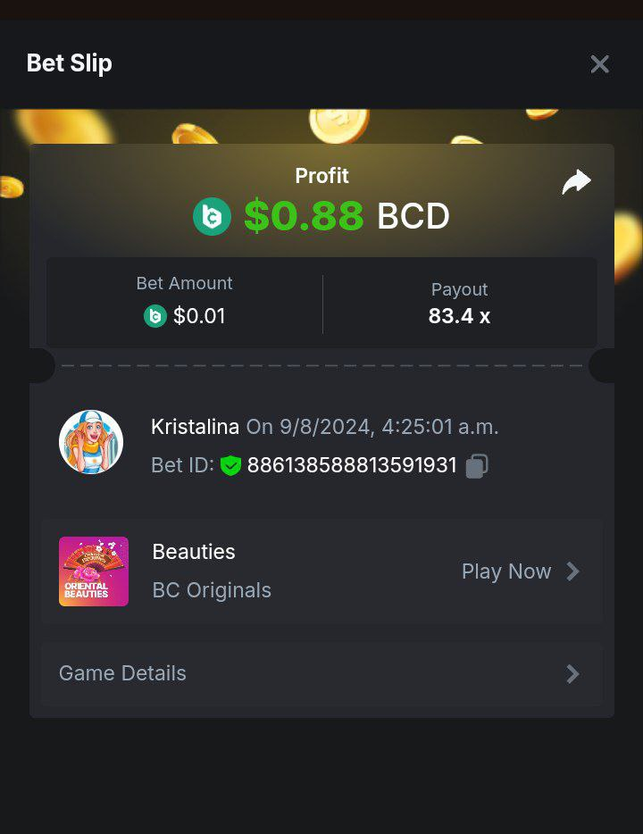 Moderator Giandreas Posted August 9, 2024 Moderator Share Posted August 9, 2024 Read Carefully Before Start To Hunt Forum Daily Challenges #678Hunt : Oriental Beauties Win the highest pay out Min Payout : 20x Min Level 10️Duration Starting : Now End time : 23.59 UTC Time How to Join? Make screenshot + paste your bet link + UID or Profile link Any coin, with min bet 0.01 USD is allowed (jb/bb/bcl not allowed)Reward Prizes 1st Place.....$7 BCD 2nd Place.....$5 BCD 3rd Place.....$4 BCD 4th Place.....$3 BCD 5th Place.....$2 BCD 🏵 Winners will be announcing next day after Roll Point! Link to comment Share on other sites More sharing options...