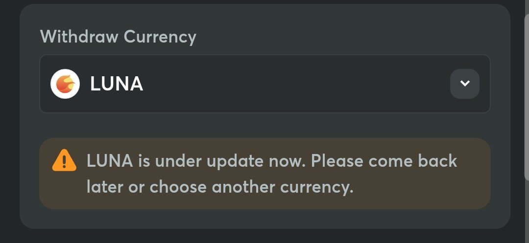 Zlnuxbmujpac Posted December 21, 2024 Share Posted December 21, 2024 I have over $1000 worth of Luna that I want to withdraw. Yet, everytime I go to try take it out there Is a notification saying it is "under update for now". I would never have deposited the Luna in the first place if I knew this was the case. There is also no way to swap it to stablecoin like other coins. So, I'm basically trapped with no ETA when I will be able to get my money out. Please help Link to comment Share on other sites More sharing options...