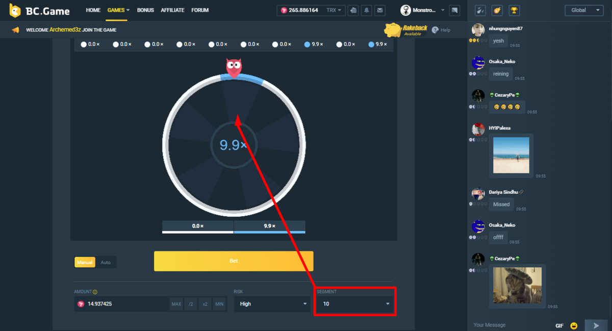 i started off playing this game on low risk and now i play it only on high risk. why? because i'm now only having to guess how deep into the segment is it going to stop when i hit my win. this changes the need to raise your bet to catch profit. instead i just change the segment to a higher number if i want a higher payout. and a lower segment if i sense its going to stop before the segment i'm currently betting for.  After a win or two i'll go back to minimum bet to race through the expected loss streaks and when i sense if its going to hit i'll raise my bet and then i'll contemplate if it will be a shallow 10 (stopping in the first half of the blue) or a deeper 10 (stopping past half way into the blue) if i decide its going to stop deeper, i will change to a higher segment.