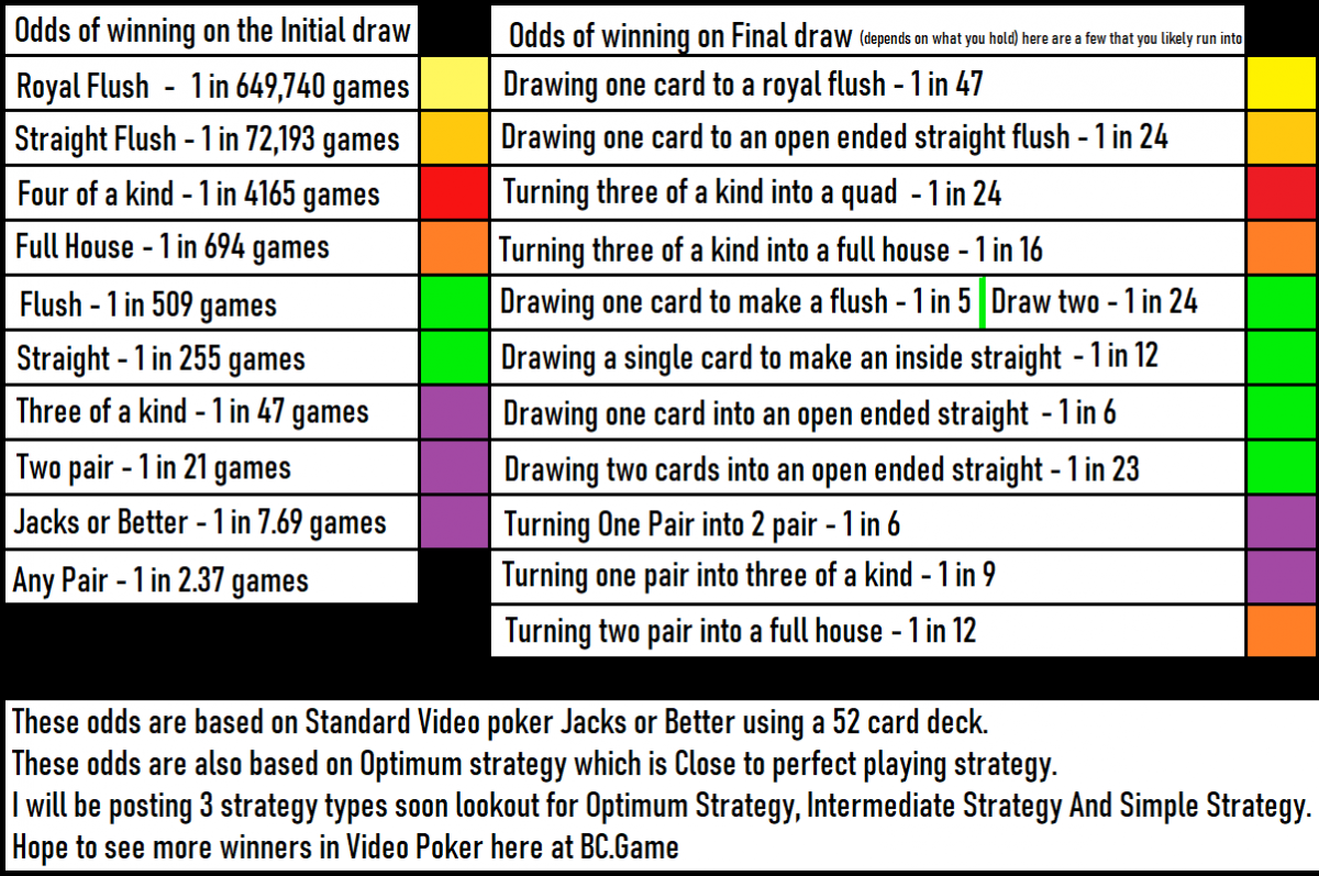 These odds are based on Standard Video poker Jacks or Better using a 52 card deck.
