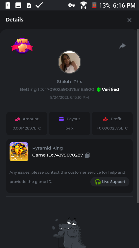 Shiloh_Phx Posted August 25, 2021 Share Posted August 25, 2021 Bet ID: #27151670848782991 Egyptian Adventures 269.4x Betid: 74379070287 pyramid king 64x Link to comment Share on other sites More sharing options...