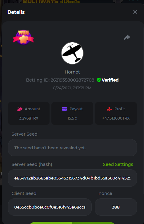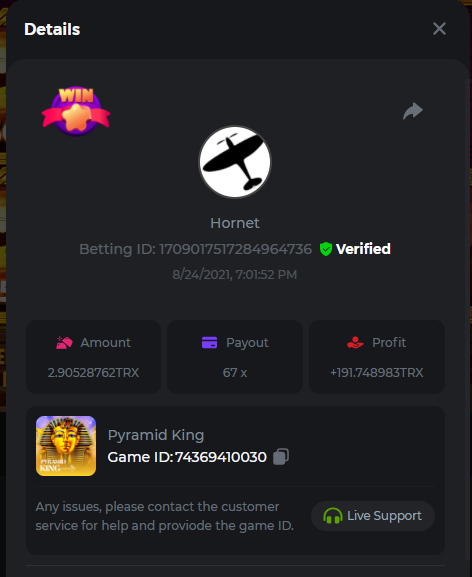 Hornet Posted August 24, 2021 Share Posted August 24, 2021 Pyramid King 67x Bet ID: 1709017517284964736 Egeyptian Adventure 15.5x Bet ID: 26219358002872708 Link to comment Share on other sites More sharing options...