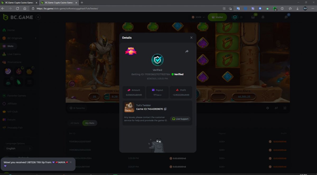 Verified Posted August 27, 2021 Share Posted August 27, 2021 Betting ID: 32203497281683473 Egyptian - 267.9x Betting ID: 1709133047020589319 Twister - 177.44x Link to comment Share on other sites More sharing options...
