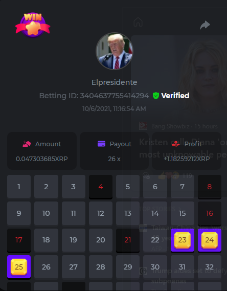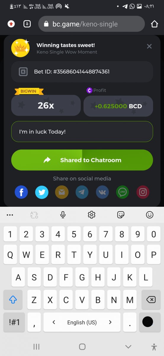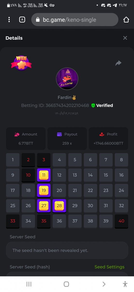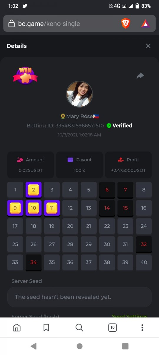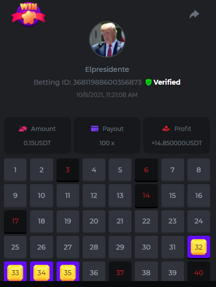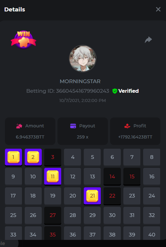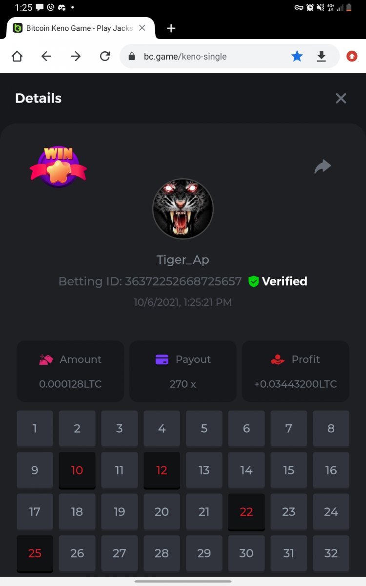 WOUNDED Posted October 4, 2021 Share Posted October 4, 2021 Welcome to keno single challeng In addition to the Top challenge,we also prepared a small challenge We hope you enjoy it Starts: 23:00 , 4 october CMT Ends: 23:00 , 8 october CMT What's the Challenge? Complete as many of the following 3 payouts on keno single(1 or all payouts) 26X _ 1 points 100X _ 3 points 259X _ 5 points The payouts must be EXACT hits - if you can't find a payout,try changing the risk level to medium or high Minimum VIP Tier Must be VIP4 or higher in order to enter this challenge. Minimum Bet Size $0.025 USD equivalent (please check the individual coin amounts below) - Bets made below this amount will not count Eligible Coins All coins are eligible (excluding JB) Available Prizes (single payout) 1points......$2 for 5 Winner 3 points......$3 for 5 Winner 5 points......$4 for 5 Winner Available Prizes (combined payout) 4 points......$6 6 points......$11 8 points......$16 9 points......$22 (For example,26X & 100X have 4 points) To enter,copy the bet ID of the bet you'd Once you've copied it,post it as a reply to this thread like so: Betting ID: 36383934979768508 In the same post,upload a screenshot of your win by clicking the game ID WITH VIEW IN USD mode ENABLED (accessible at the bottom of dropdown menu for your wallet up top.This way,we can ensure that your bet indeed met the minimum requirement at the time of placing it Please combine all of your hits together in a SINGLE post.Edit,don't create a new post Bets must be posted within 24 hours of placing bet in order to keep things fair for everyone Bets must be made during the specified time window stated above. This thread will lock automatically when the time period is over Each user is only allowed with one account Otherwise,the wrongdoer will be dealt with Failure to follow instructions will result in your submission being null and void Payouts will be made within 48 hours of challenge completion,please be patient Let's go Good luck Link to comment Share on other sites More sharing options...
