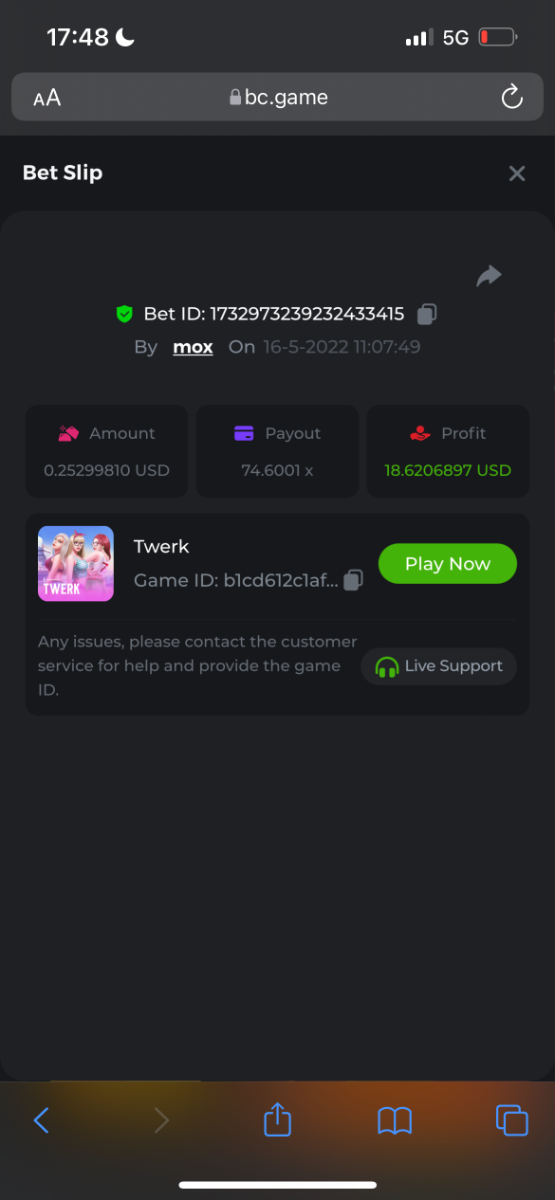 nssBoB Posted May 17, 2022 Share Posted May 17, 2022 Twerk - 106.6x - Bet ID: 1733098634392103296 https://bc.game/sd/?sd=10KQ6EFJ1I9CSZ Link to comment Share on other sites More sharing options...