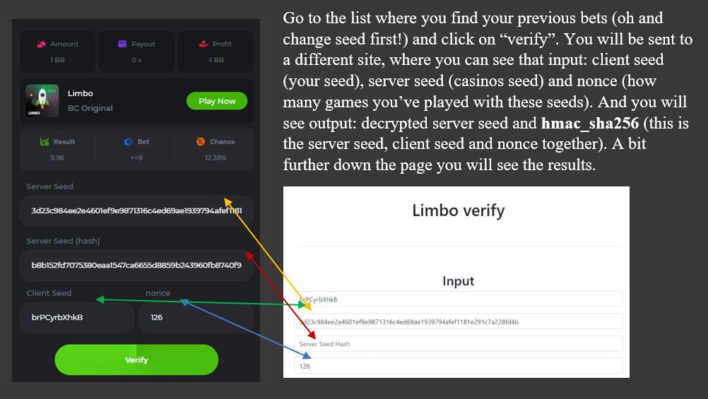 Creepybits Posted June 17, 2022 Share Posted June 17, 2022 It’s essential to stretch before you start Limbo. Otherwise, you risk hurting yourself bad. Especially if you’re 30+. Don’t worry about looking like a fool while doing the Limbo; everyone does. If you Limbo with co-workers, don’t forget to bring a camera. You will have great pictures for extortion whenever you need someone to cover for you at work. Not that Limbo? Oh, okay. Limbo Coco got himself a rocket which he named Limbo. Unfortunately, Limbo tends to explode at the most inconvenient times. The challenge is to get off the rocket before it explodes. But not too soon. Get off too soon, and your profit will be smaller, get off too late, and you lose all profit. How far can you go before getting off the rocket? Do you have the nerves of steel that it takes to reach the heights (and profit) others can only dream off? And precisely what are the chances of getting the stars? Let’s find out! The bet I made a bet of 10 Satoshi in the hope of making a profit of 70 Satoshi (10 x 8 = 80 and subtract the initial bet = 70 Satoshi). The game states that I have a 12.375% chance of hitting my targeted 8x. 100/12.375 = 8.080. So statistically speaking, I should hit 8x once every eight games (that wouldn’t be very profitable!) For my first try, I got 8x on my 6th try, so I made 10 Satoshi in profit. On my second try, it took 22 tries to get 8x. Let’s add them together! 6 + 22 = 28 and I got 8x two times, so 28/2 = 14. I’m not a genius at math, but 14 is more than 8! It doesn’t seem like a 12.375% chance to me! More like 7.149% chance (100/7.149 = 13.987 – close enough!). Why is that? Is this some kind of scam!? Let’s try betting the same amount 100 times, and see what happens. Well, that’s more like it. Out of 100 games, I got 8x 12 times, exactly 12%! What can we learn from this? First, we can say that a ~12% chance of winning doesn’t mean that every 8th game will give you a win. The possibility of winning can be interpreted in a few different ways. Large samples Given a large enough sample, the number of winning games will eventually amount to ~12%. While collecting this large sample, you will sometimes have longer streaks without hitting 8x at all, and other times you will hit 8x several times within a few games. The larger the sample (i.e., the more games you’ve played), the more accurate the chance of winning. Single sample Every game you play, you will have a 12% chance of hitting 8x, which means there’s an 88% chance that you lose. On every game you play. Misconception I’ve played 12 games without hitting 8x, which means that 8x has to come within just a couple of games. Incorrect, sort of. Of course, you will eventually hit 8x, but the chance of hitting 8x doesn’t increase every time you don’t hit it. During the 100 games I played above, my longest streak of not getting 8x was 25 (just to hit 8x twice in a row right after). There are three kinds of lies: Lies, Damned Lies, and Statistics Famous words attributed to Mark Twain (who himself attributed it to the British prime minister Benjamin Disraeli). But could you claim that statistics lie? I don’t think so. You can, however, misinterpret statistics or misrepresent them to mislead someone. Now I don’t believe the statistics at BC.game is misleading. But I understand how it might seem that way for someone who doesn’t know how to interpret it. When it says you have a 12% chance of winning, it’s 100% correct. If you were to try and hit the green ring by throwing darts from a 10 feet distance, you wouldn’t expect it to grow bigger every time you missed, would you? It’s precisely the same as the chance of winning works. Provably fair As with all in-house games at BC.game, Limbo is provable fair. Let’s check if my last bet in Limbo was fair or if someone scammed me out of 1 BB coin. The output will look like this. Take the first 13 numbers from hmac_sha256 d588154f10de6 convert it to decimal form using any hexadecimal converter 3756487196347878 the decimal number needs to be divided by the maximum value (HEX) fffffffffffff fffffffffffff = 4503599627370495 in decimals. 3756487196347878 / 4503599627370495 = 0.83410771541 The house edge is 1% so we need to calculate 99/(1-0.83410771541) = 99/0.16589228459 = 596.772780872 Remove the decimals and divide by 100. 596 / 100 = 5.96 The result of my last Limbo game is 5.96. Less than 8, which means I lost, and no one tried to scam me out of my 1 BB coin. Link to comment Share on other sites More sharing options...